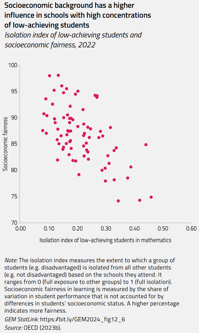 Analysis of the 2022 PISA data shows that student concentration and grouping does not seem to have a direct correlation with mean scores in mathematics, but it does correlate with overall socioeconomic fairness (i.e. the impact that socioeconomic factors have on achievement). There is a negative correlation between socioeconomic fairness and the 2022 PISA isolation index of low-achieving students, which measures the degree to which low-achieving students in mathematics are separated from other groups: the higher the value, the higher the degree of isolation. The higher the value of the isolation index, the lower the socioeconomic fairness and thus the stronger the association between student socioeconomic background and their achievement.