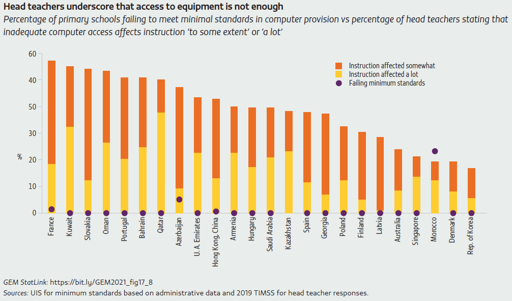 The utility of educator facility assessment has relevance for the monitoring of SDG target 4.a. In particular, government-reported administrative data tend to yield more optimistic assessments of school facilities than those by head teachers. Where administrative data point to all primary schools having access to computers, head teacher assessments reveal shortcomings. Over half of head teachers in France, Kuwait, Oman, Portugal and Slovakia reported that inadequate access to computers moderately or strongly affected learning, yet the countries’ administrative data show all schools having access to computers for pedagogical purposes.