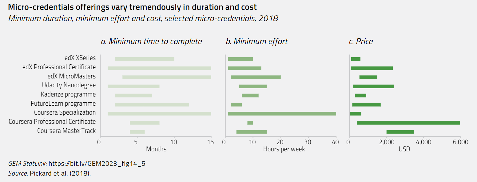 Micro-credentials are only ‘micro’ relative to traditional degrees and not necessarily as short as the name may suggest. A 2018 review of 450 micro-credentials offered by some of the major online providers found the average time to complete a course was 3 to 12 months, although some courses took over 50 months to complete. Minimum completion time ranged from 1 to 15 months. While some courses only require a few hours per week and can easily be completed alongside other commitments, others call for 10, 20 or even up to 40 hours per week, essentially the equivalent of a part-time or even full-time job. Costs similarly varied by orders of magnitude, from almost or actually free to thousands of US dollars.