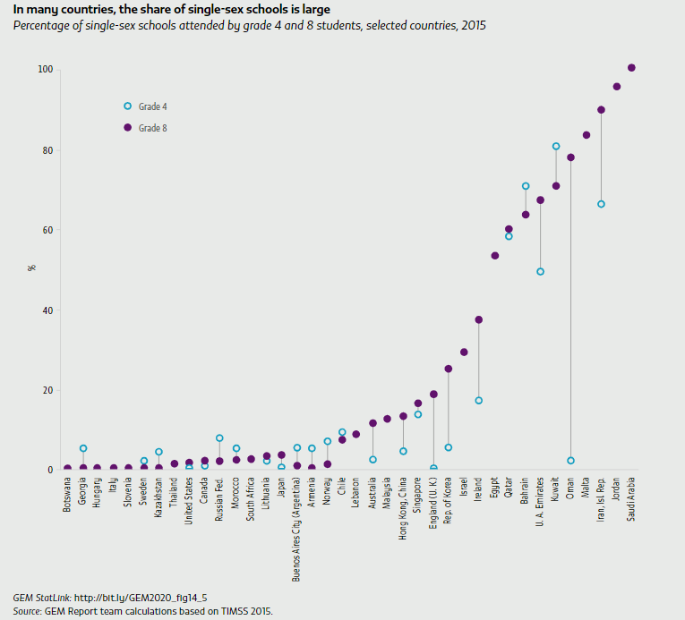 Although sudden changes in school system structure are rare, comparisons over time for the countries that participated in the 2007 and 2015 TIMMS capture some shifts. Single-sex schooling decreased in Australia and the Republic of Korea. The latter shifted to co-education schools in the 1980s, and a recent policy decisively favours co-education (Dustmann et al., 2018). The situation is more complex in Western Asia. In Jordan, the share of single-sex lower secondary schools increased by 8 percentage points and the share of students attending them by 12 points. One reason may be the influx after 2011 of Syrian refugees, who attended public single-sex schools. The share of single-sex schools decreased in Bahrain and Kuwait. While public schools remain segregated in Gulf Cooperation Council countries, the changes are attributable to an increasing share of mixed private international schools. The United Arab Emirates introduced co-education primary schooling in 2018 (Dajani and Rizvi, 2018).