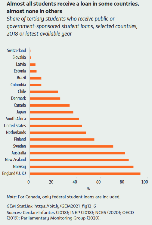 Student loans have become an increasingly popular instrument to promote affordable access to tertiary education. They are currently available in over 70 countries, to varying degrees. The average share of tertiary students receiving a public or government-sponsored student loan in 19 mostly high-income countries was 40%, ranging from 1% in Switzerland to 42% in South Africa and 84% in New Zealand. Student loans can increase access at a lower cost to governments than tuition subsidies or scholarships and grants and can even help improve equity, completion rates and graduates’ labour market outcomes. Student loans that also cover living costs allow students to be financially independent from their parents (Ziderman, 2017).