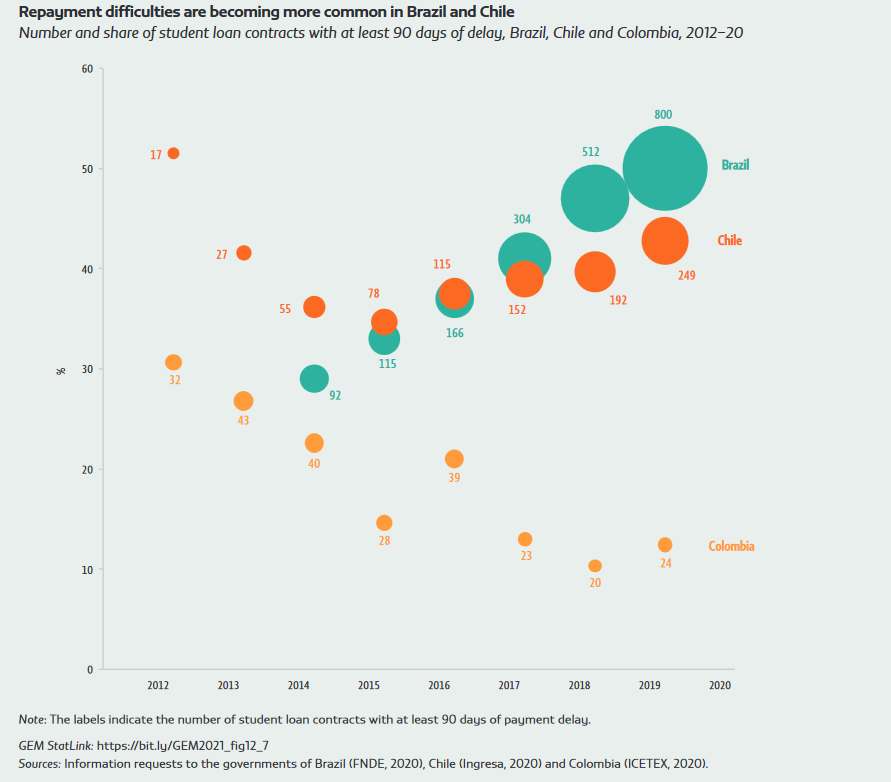 High levels of student loan defaults and payment delays, therefore, are hardly surprising. In Brazil and Chile, over 40% of the student loan contracts in the amortization phase had at least three months of payment delays, enough to harm borrowers’ credit reputation. The situation is even more concerning for those who drop out, as they become more likely to have lower earnings, delay payments and default on their loan. In Chile, over 70% of borrowers who dropped out have notable delays in student loan payments, compared with 34% of those who graduated (Ingresa, 2019). In the United States, late payments and defaults are highest at low levels of debt – around US$2,000 – likely from students who dropped out early (D'Amato, 2021).