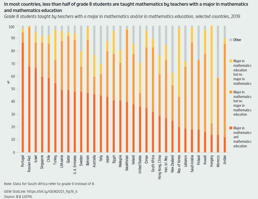 In at least 16 countries that participated in the 2019 Trends in International Mathematics and Science Study (TIMSS), over 10% of grade 8 students were taught mathematics by teachers without a major in mathematics and/or in mathematics education. Taking the stricter definition of having both, this is true for over half the students in most participating countries. In Australia, there is a 76% chance of a student having at least one out-of-field mathematics teacher between grades 7 and 10, and a 35% chance of having at least two (Prince and O'Connor, 2018).