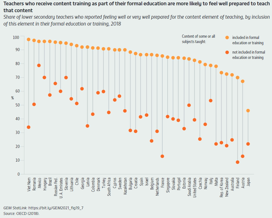 Out-of-field teaching may have detrimental consequences on teaching and learning. Some studies have found that it negatively influences teachers’ self-esteem, confidence and relationships within the school community (du Plessis et al., 2014), as well as job satisfaction and likelihood of staying in the profession (Sharplin, 2014). Instructional practices may also differ. Out-of-field teachers tend to rely more on textbooks and pre-prepared material and be less likely to make connections across topics and engage in creative classroom activities (Napier et al., 2020; Van Overschelde and Piatt, 2020). Across all education systems participating in TALIS, teachers whose formal education or training included content of some or all the subjects they teach were more likely to feel well prepared for that element of teaching.
